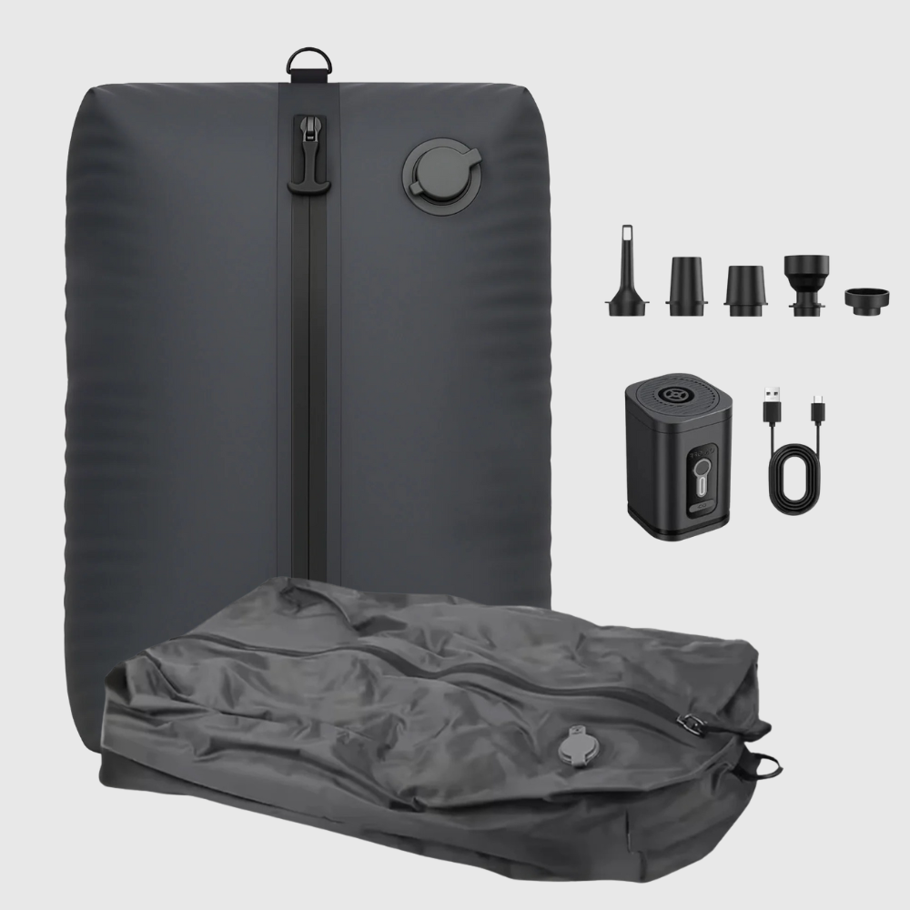 Nasza elektryczna pompka USB-C kompresuje całą zawartość Twojej torby w zaledwie 30 sekund – bez potrzeby podłączania do prądu.